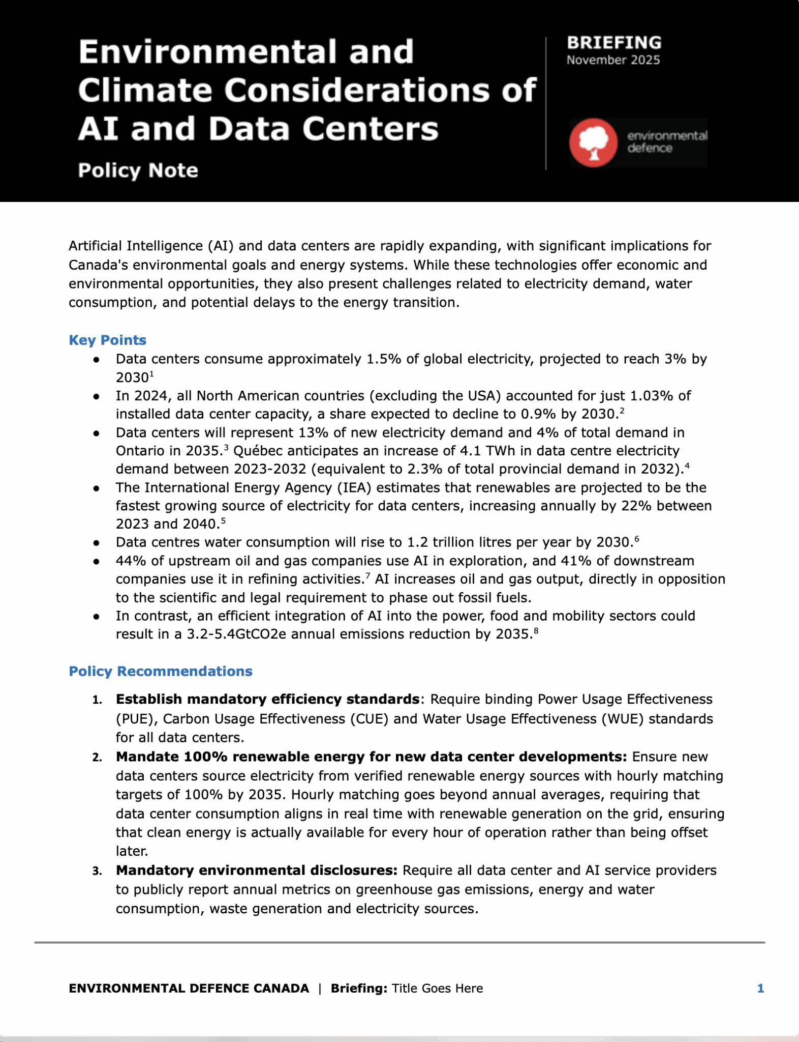 Artificial Intelligence (AI) and data centres are rapidly expanding, with significant implications for Canada’s environmental goals and energy systems. While these technologies offer economic and environmental opportunities, they also present challenges related to electricity demand, water consumption, and potential delays to the energy transition.